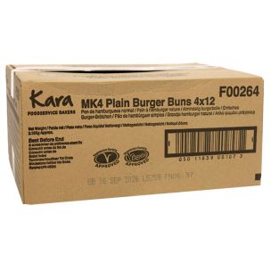 Fully baked and pre-sliced burger bun, ready to thaw and serve. Each box comes with 48x50g burger buns.