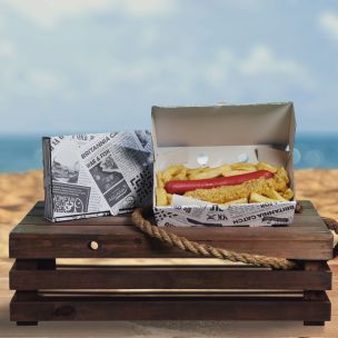 Retro, newspaper print, cardboard fish and chip box. Ideal for serving smaller portions. 100% recyclable, biodegradable and compostable. Keeps food hot and crispy.Collection: