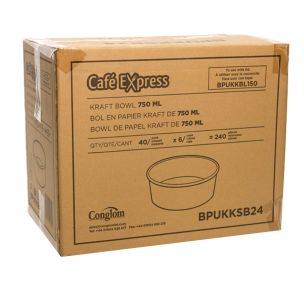 Durable 24oz/750ml round kraft bowls suitable for hot or cold meals. Perfect for restaurants, catering, and takeaway services. Compatible with CON239 lids, eco-friendly and recyclable.Collection: