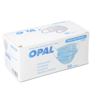 Disposable face covering with three layer filtration and ear loops. 50 masks in a box. Latex free.
