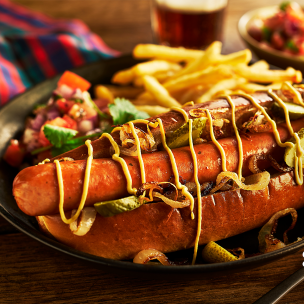 A long, premium pork hot dog measuring 26cm, offering a smooth texture and rich, classic flavour. Ideal for gourmet hot dogs, street-food menus, loaded dogs, and catering events. Each 115g sausage provides consistent size and quality, ensuring easy preparation and great customer satisfaction. Supplied in a convenient pack of 10 for simple storage and use.Collection: